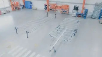Der modulare abnehmbare Anhänger LIFT&GO besteht aus einem homologierten Fahrgestell, das eine Stahlkonstruktion, 2 Achsen, eine Deichsel und einen beweglichen Lichtbalken mit Nummernschild umfasst. Zusätzlich ist ein Stahlrahmen enthalten, der als eingebauter Boden dient.